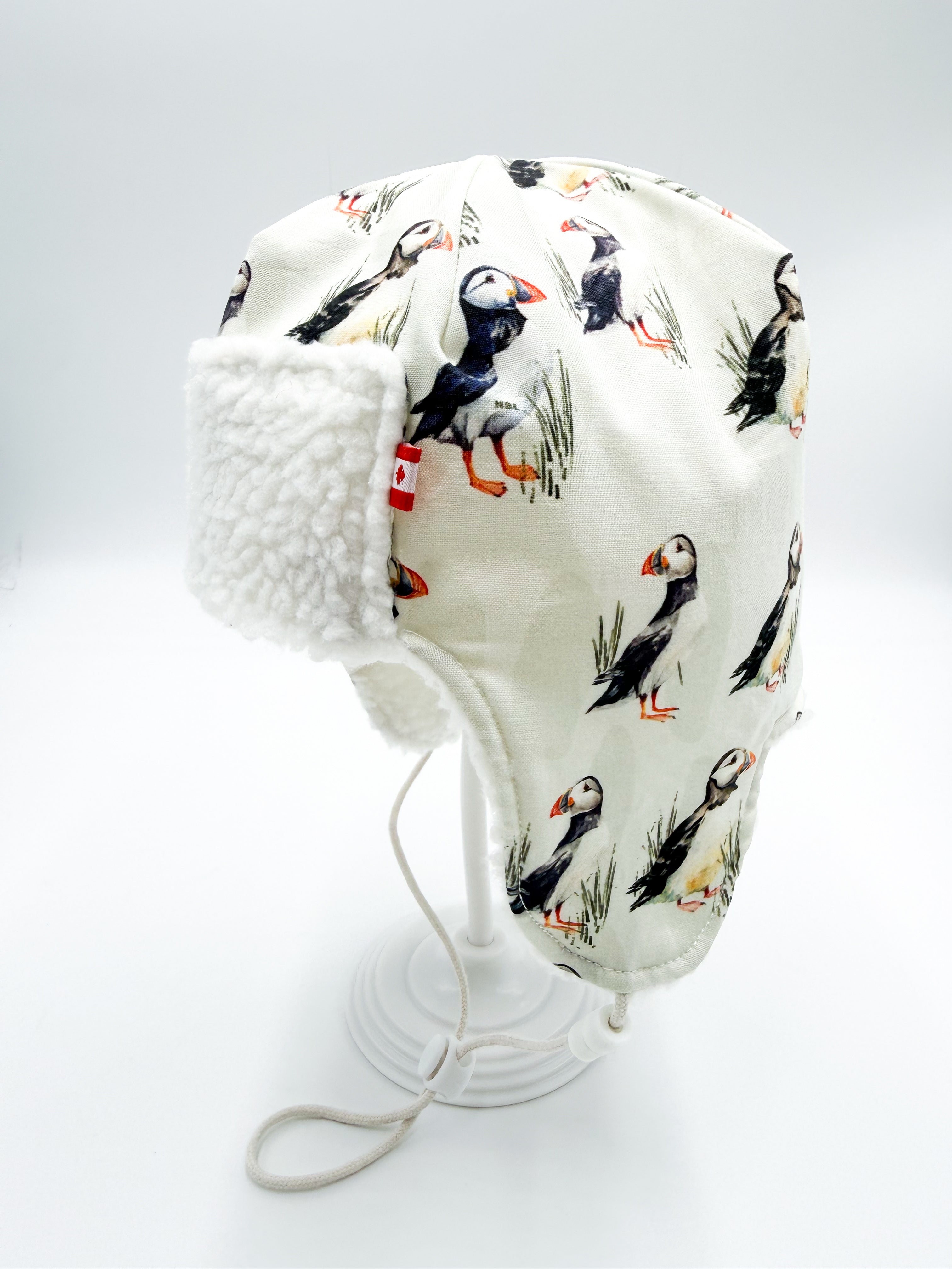 Handmade in Newfoundland & Labrador, this luxury baby winter hat features a soft sherpa lining for cozy warmth and a structured cotton exterior for durability and timeless appeal. Designed with full coverage for the head and ears, it’s ideal for stroller walks, crisp coastal air, and everyday cold-weather adventures.